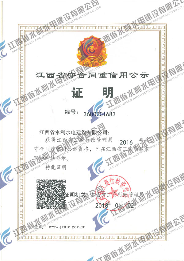 近日,公司獲評2016年度江西省守合同重信用公示資格。